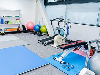 筋力維持のために設置された筋トレスペース。昼休みになると10名ほどの社員が集まり、談笑しながら筋トレを行っています。