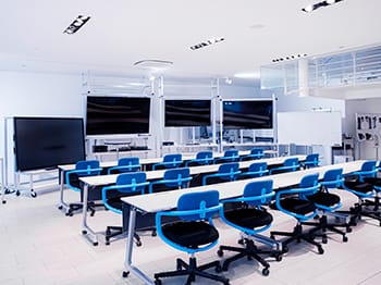 社員研修や打合せ、採用イベントなどで用いるスペース。全面窓ガラスで外からの太陽光が入る明るいスペースです。